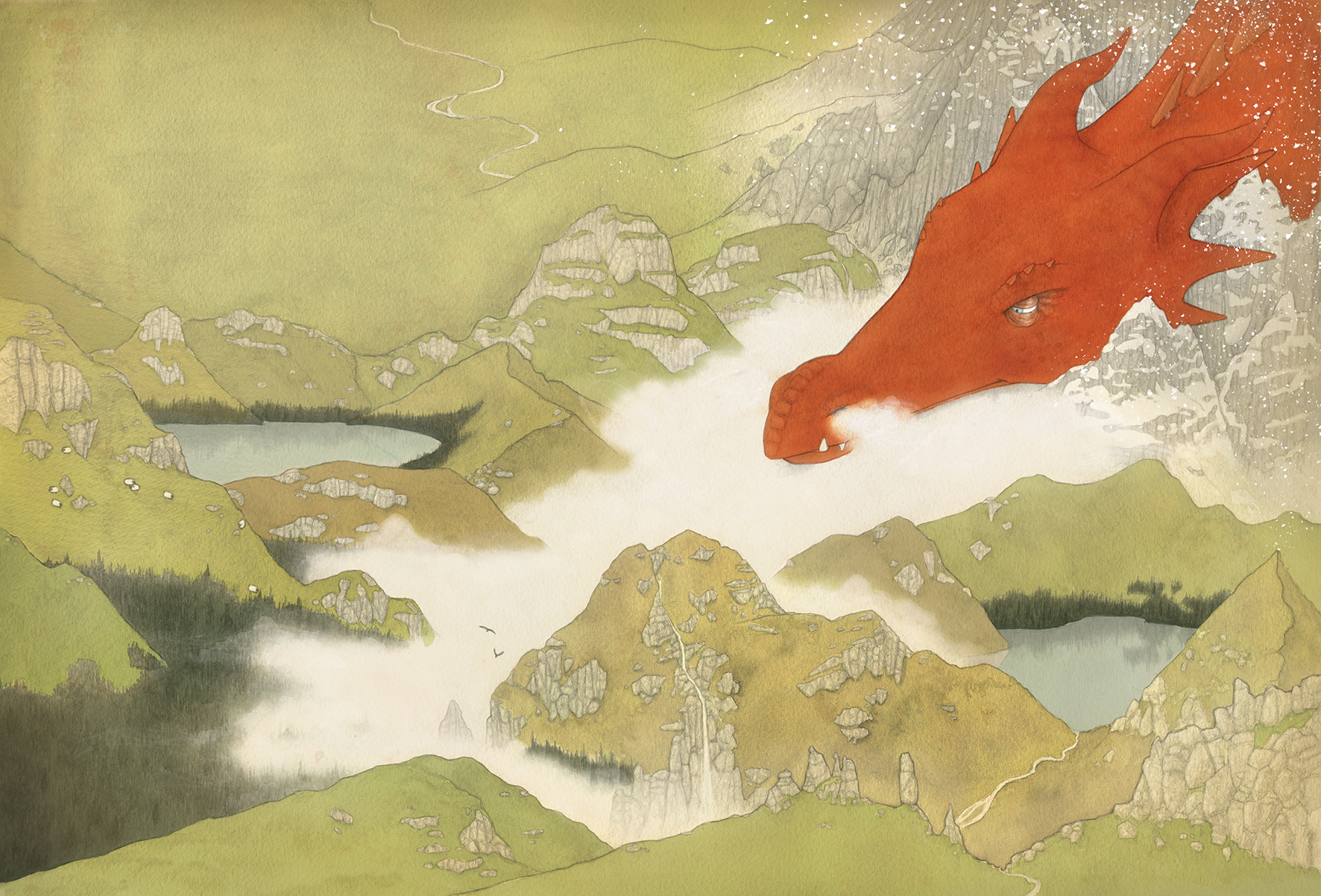 My 1st favourite is the first spread where the dragon is laid out amongst the mountains because it was the one that flowed most easily from idea to imagery. Also, it was the rough that got me the job. My 2nd favourite is the vignette on the last page, because although it is quite simple compared to some of the other spreads – though the untrained eye might not detect it – I can see some of my strongest work in it. Also, everyone needs a good happy ending.