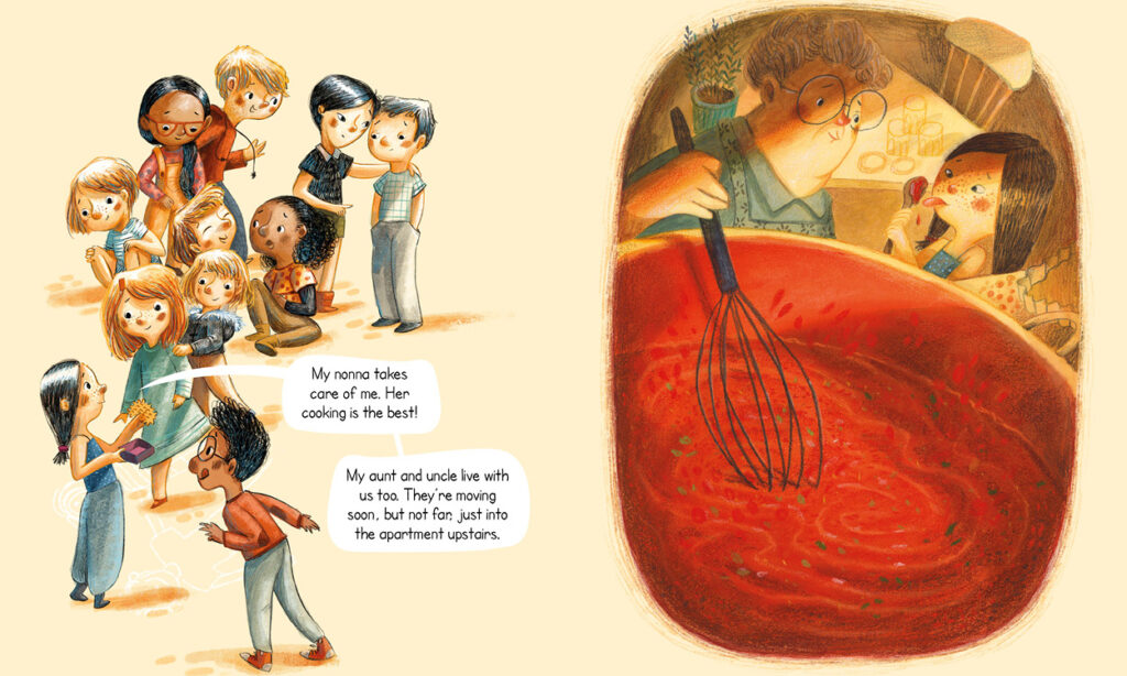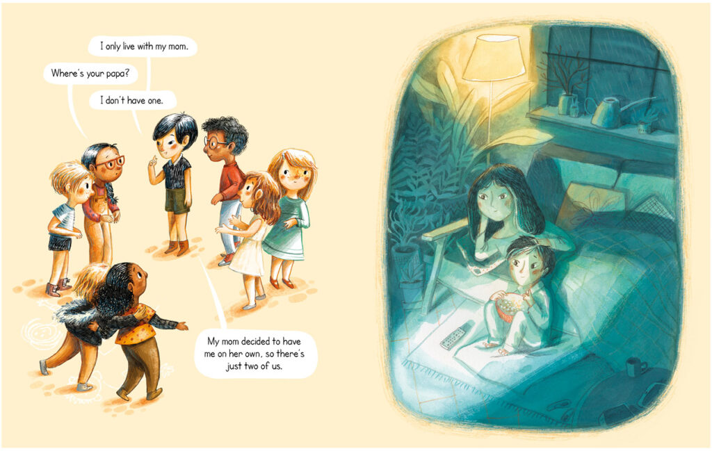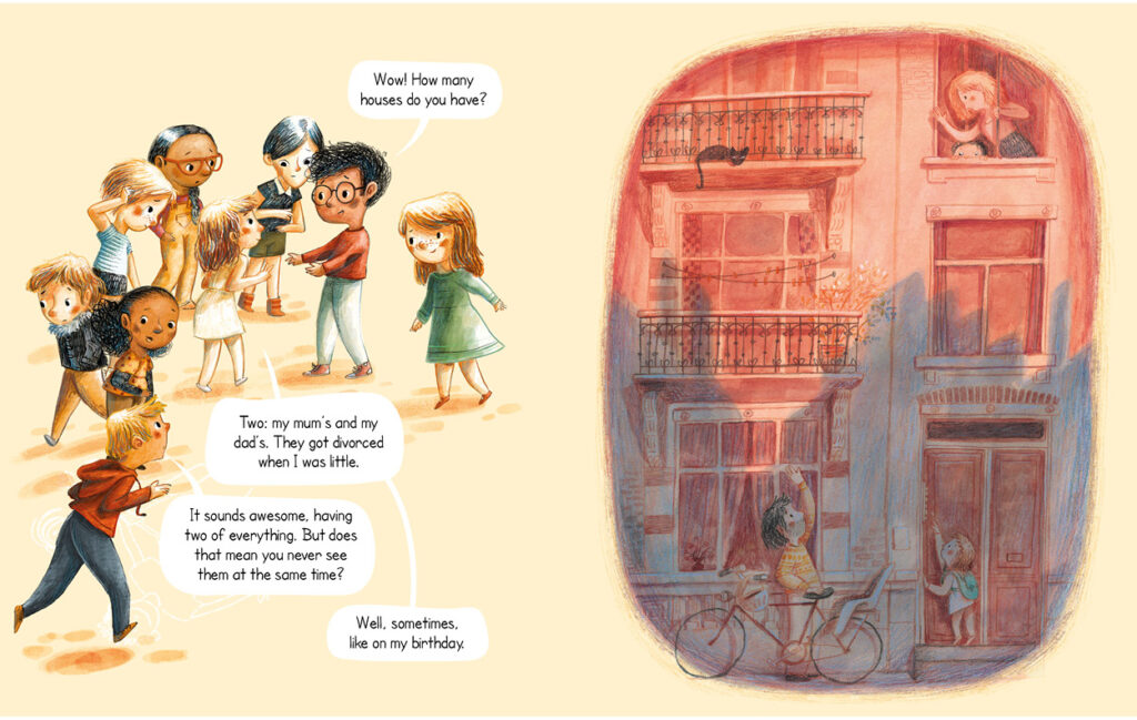 In the illustrations I wanted to show the variety of families by using different colours for all the illustrations on the pages on the right of the book. I also tried to draw happy situations with warm colours to represent the warm cocoon that every family is supposed to be.