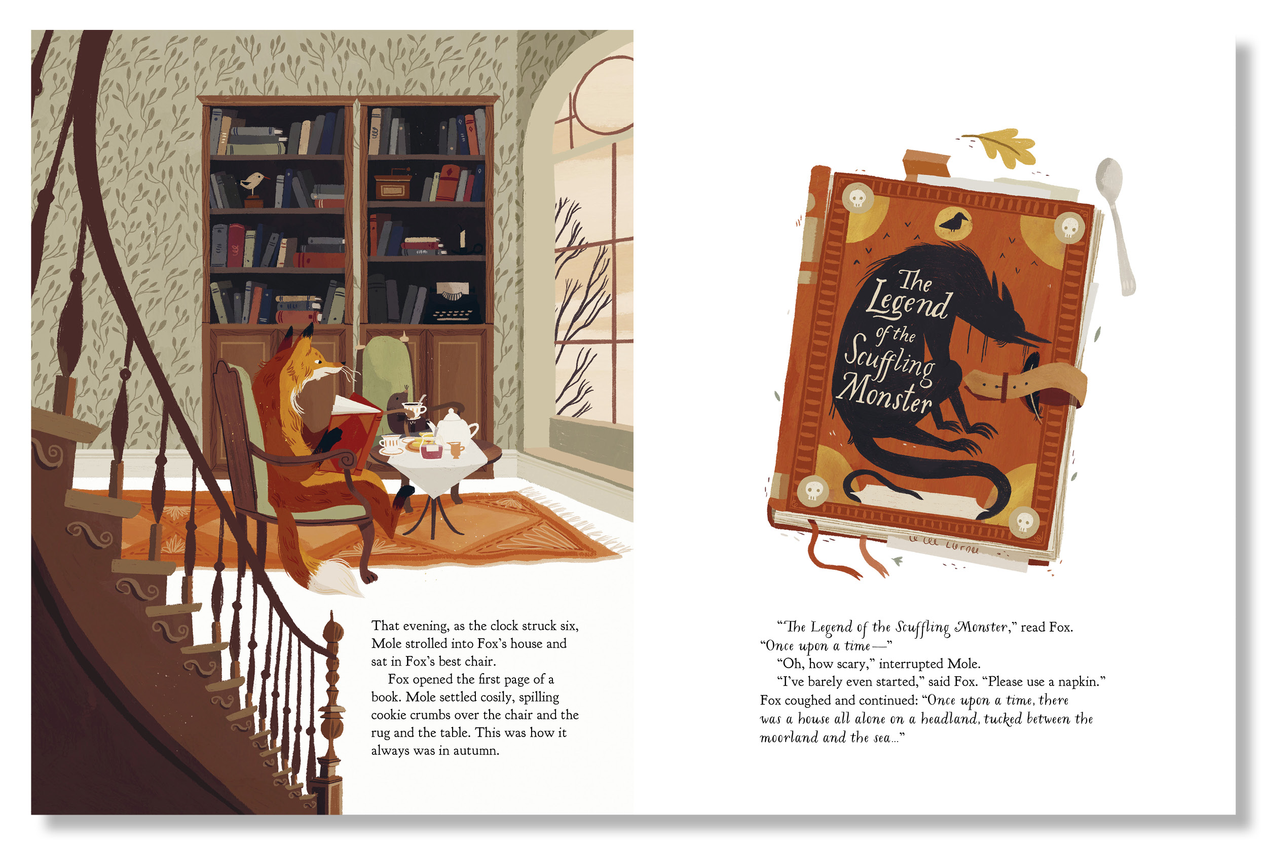 As autumn draws in, the friends read a spooky story together (that Mole keeps interrupting) about a racoon who transforms into a scuffling monster (a slightly spooky bit) while Mole eats Fox’s cookies (all of them).