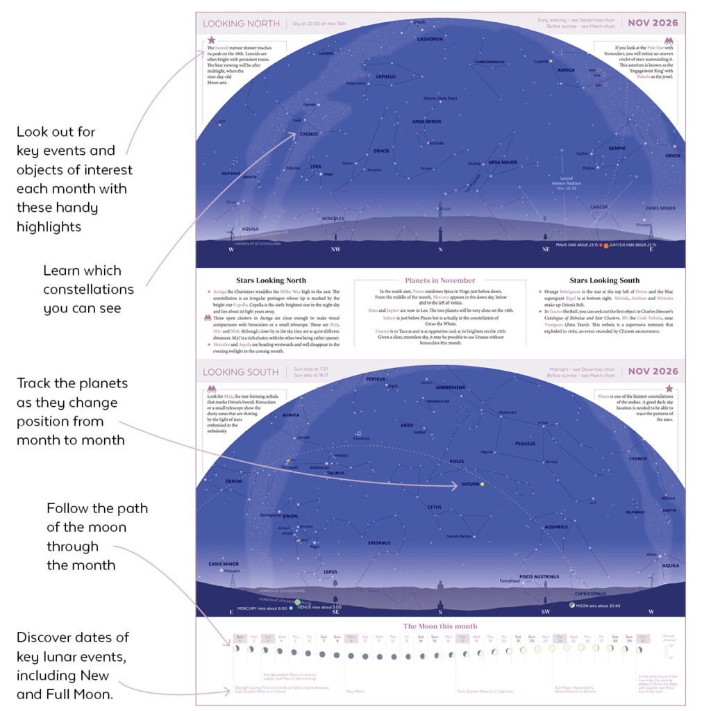 Each monthly chart features two views of the night sky, looking north and south, and a visual guide to the phases of the moon and the movements of the planets.