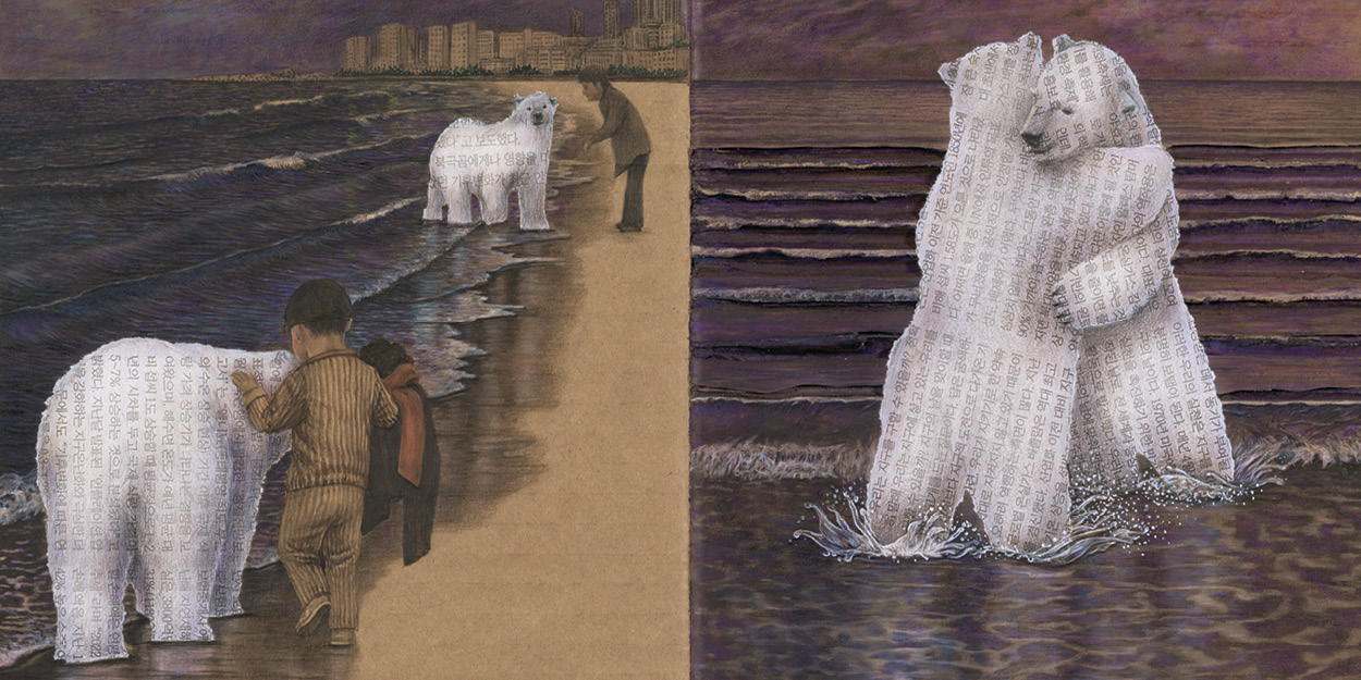 Our Art and Production Director met illustrator Park Jihee on the very beach that is the inspiration for the end of The Polar Bear Day. This striking, wordless picture book with characterful illustrations painted directly onto old cardboard boxes, turns everyday rubbish into something beautiful.