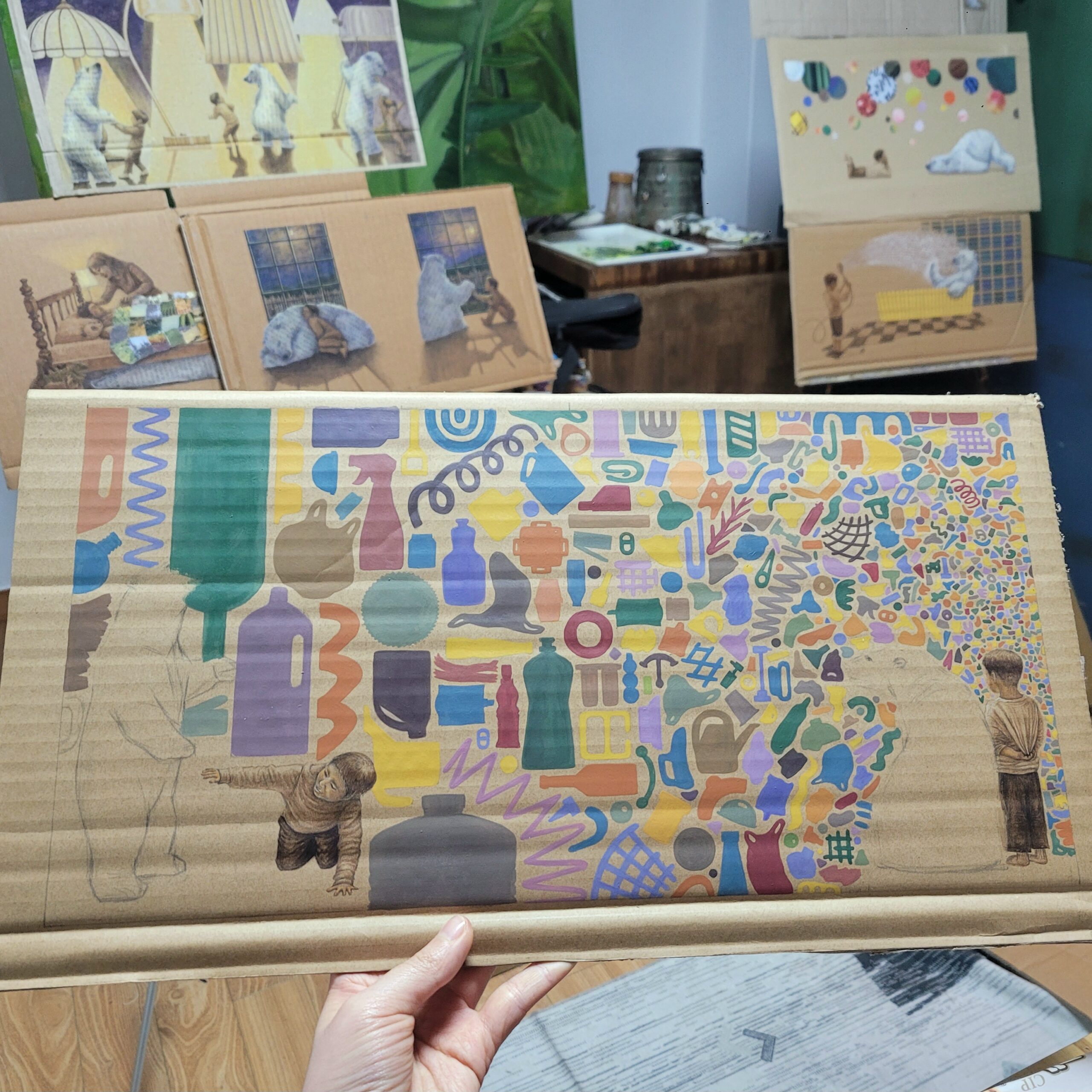 The illustrations were created using colored pencils, watercolor, acrylic paint, ink, and collage elements (such as newspaper and magazine clippings about environmental issues) on cardboard.